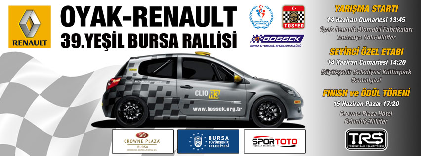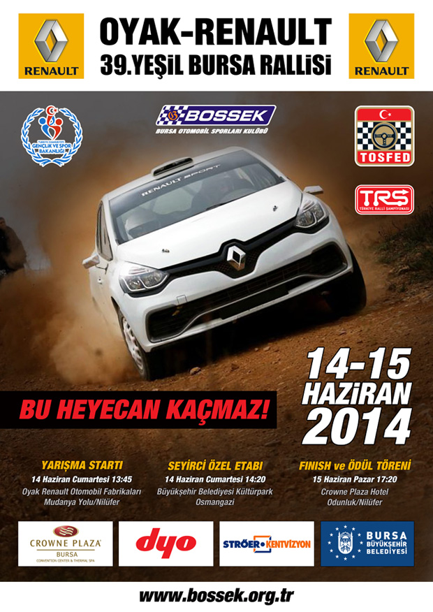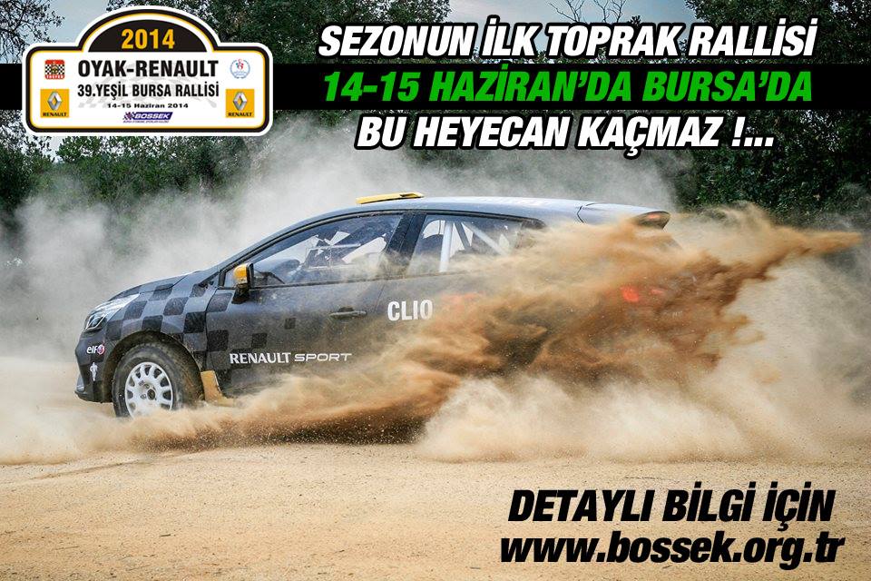 2014 Türkiye Ralli Şampiyonası’nın 3.ayağı olan OYAK-RENAULT 39.Yeşil Bursa Rallisi, Bursa Otomobil Sporları Kulübü tarafından 14-15 Haziran tarihlerinde organize ediliyor. Bu yıl 39.kez düzenlenen ve sezonun ilk toprak rallisi olan organizasyon, OYAK-Renault ana sponsorluğunda, Crowne Plaza Bursa, Dyo Boyaları, Ströer Kentvizyon, Sadabat Sarayı ve Bursa Büyükşehir Belediyesi katkıları ile gerçekleştirilecek.