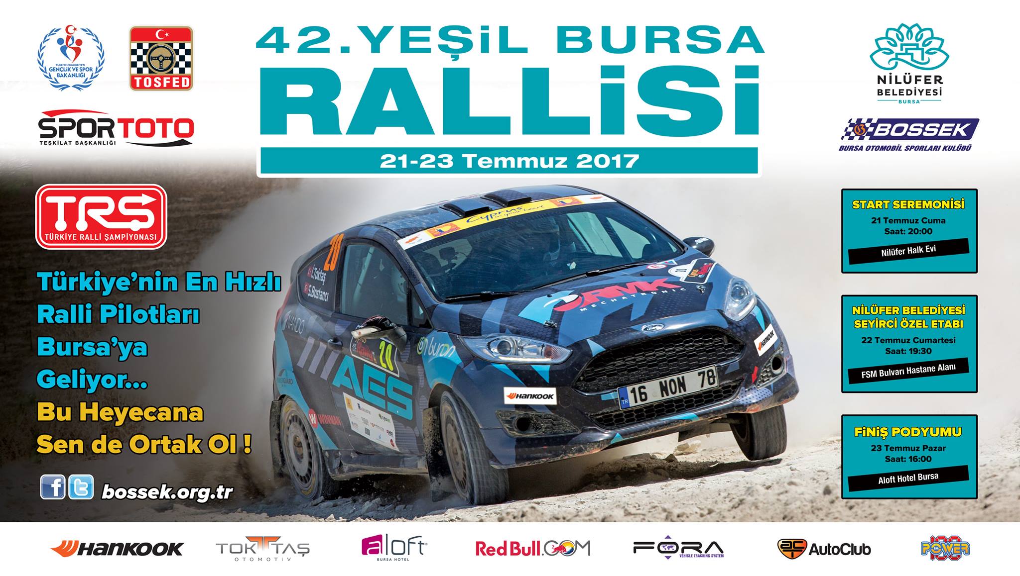 2017 Türkiye Ralli Şampiyonası 4.yarışı olan ve Bursa Otomobil Sporları Kulübü (BOSSEK) tarafından bu yıl 42. kez düzenlenen Yeşil Bursa Rallisi, 21-23 Temmuz tarihlerinde gerçekleştiriliyor. Nilüfer Belediyesi katkılarıyla düzenlenen organizasyon, Hankook Toktaş Otomotiv, Aloft Hotel Bursa, Serpa İnşaat, RedBull.com, Fora Araç Takip, Auto Club, Melkar Otomotiv ve Power FM sponsorluğunda düzenleniyor.